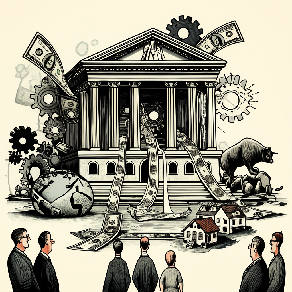 中央銀行建築物插圖,齒輪和貨幣流出代表量化寬鬆影響全球金融市場、股市和房地產,投資者觀察場景