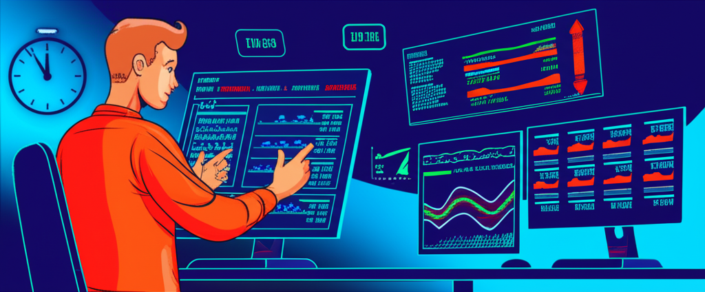 專注剝頭皮交易者的插圖,顯示多螢幕金融圖表與高頻決策環境