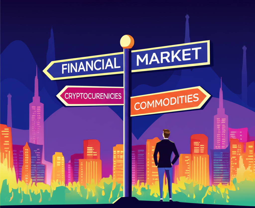 投資者站在金融市場十字路口,箭頭指向加密貨幣、股票和大宗商品,象徵新手投資選擇的起點